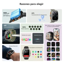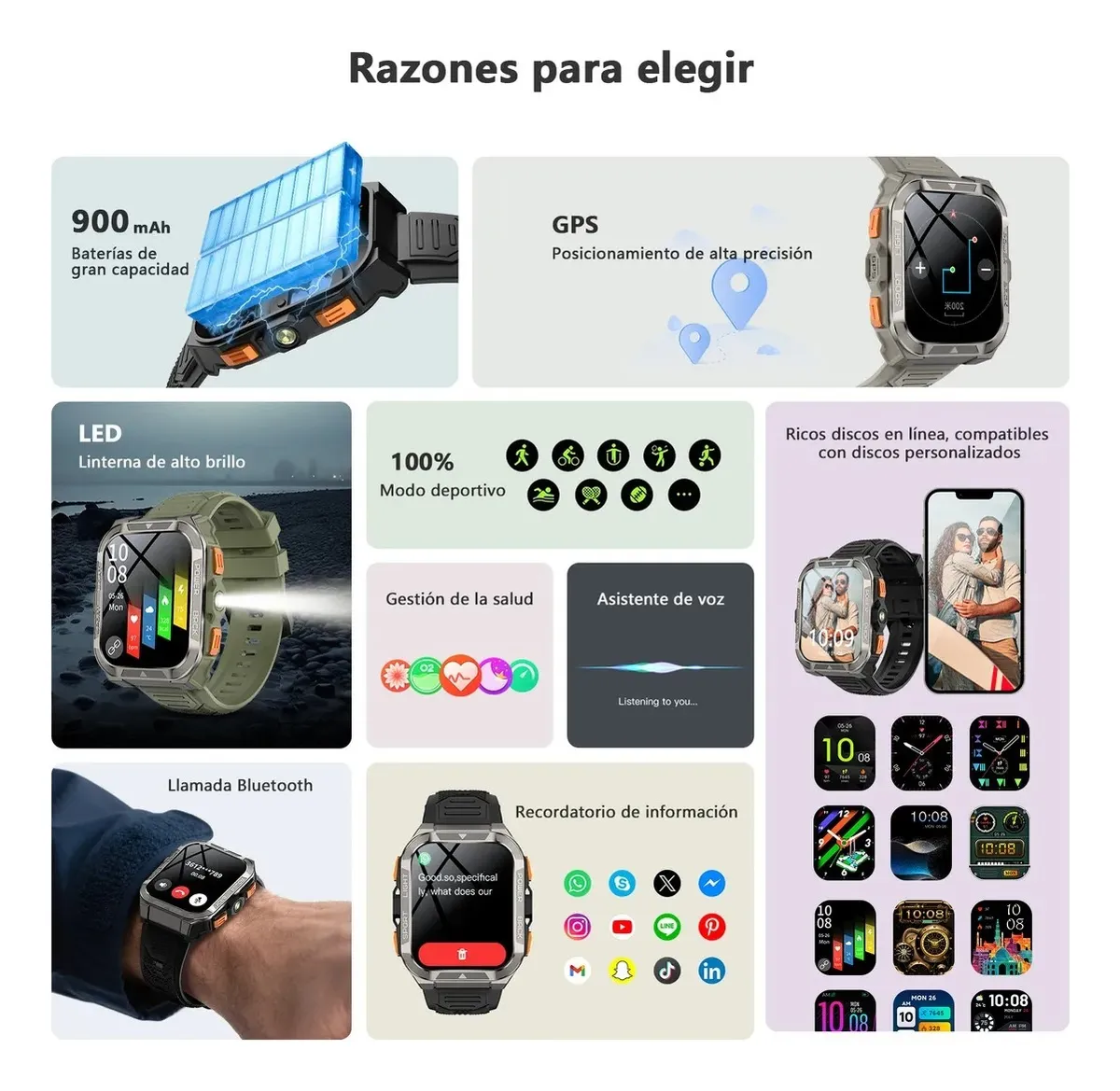 Incluye GPS integrado, brújula digital, linterna LED multifunción y más de 100 modos deportivos para optimizar tu rendimiento. Monitorea tu frecuencia cardíaca 24/7, oxígeno en sangre (SpO2), sueño, estrés y hasta recordatorios de salud.